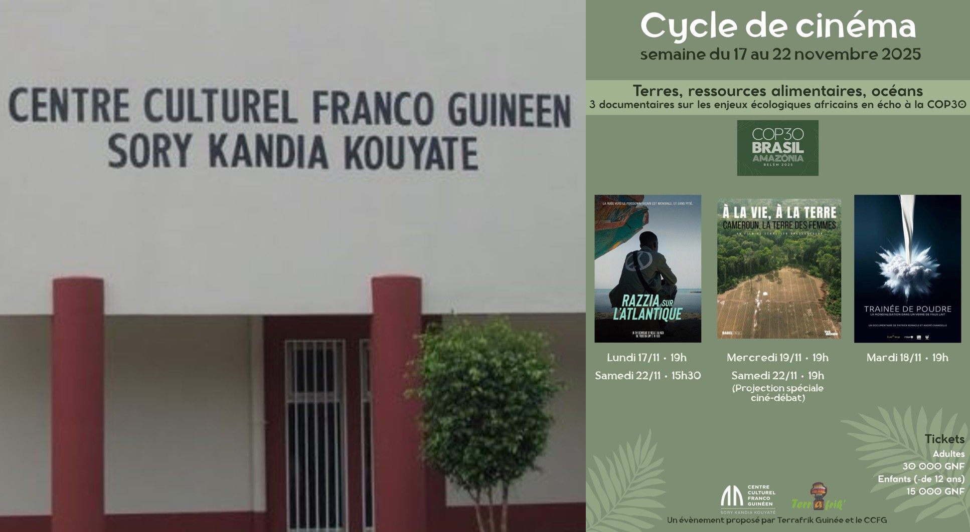 Alors que l’urgence climatique rassemble les dirigeants de la planète au cœur de l’Amazonie brésilienne pour une COP30 décisive, la Guinée s’invite dans le débat mondial par la voie culturelle. Du 17 au 22 novembre 2025, le Centre Culturel Franco-Guinéen (CCFG) et l’organisation TerrafriK Guinée proposent un cycle de cinéma documentaire inédit, transformant les salles obscures de Conakry en espace de résonance des grands enjeux environnementaux africains.
